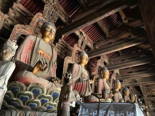 觀音閣內(nèi)中央的須彌座上,聳立著一尊高16米的泥塑觀音菩薩站像,菩薩頭部直抵三層的樓頂。因其頭上塑有十個小觀音頭像,故又稱之為“十一面觀音”,菩薩面容豐潤、慈祥,兩肩下垂,軀干微微前傾,儀態(tài)端莊,似動非動。觀音塑像兩側(cè)各有一尊脅侍菩薩塑像,塑像是遼代的原塑,雖制作於遼代,但其藝術風格類似盛唐時期的作品,是我國現(xiàn)存的最大的泥塑佛像之一。