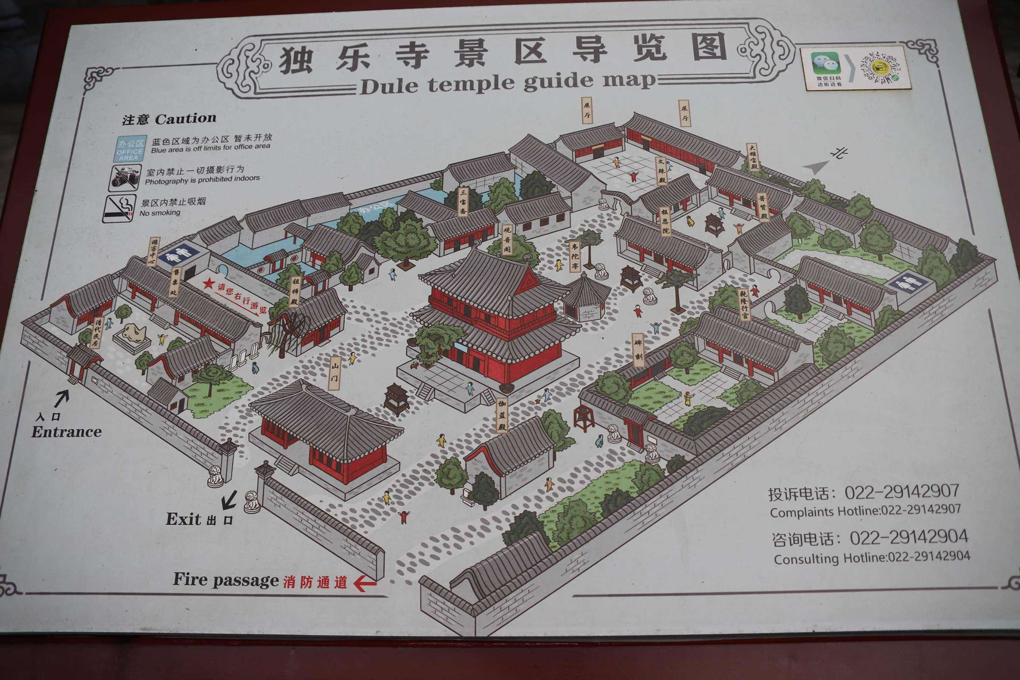 獨樂寺山門和觀音閣為遼代建筑,其它都是明、清所建。全寺建筑分為東、中、西三部分;東部、西部分別為僧房和行宮,中部是寺廟的主要建筑物,白山門、觀音閣、東西配殿等組成,山門與大殿之間,用迥廊相連結。山門面闊三間,進深兩間,斗拱相當于立柱的二分之一,粗壯有力,為典型唐代風格,是中國現(xiàn)存最早的廡殿頂山門。 山門內(nèi)有兩尊高大的天王塑像守衛(wèi)兩旁,俗稱“哼”“哈”二將,是遼代彩塑珍品。獨樂寺山門正脊的鴟尾,長長的尾巴翹轉(zhuǎn)向內(nèi),猶如雉鳥飛翔,是中國現(xiàn)存古建筑中年代最早的鴟尾實物。
