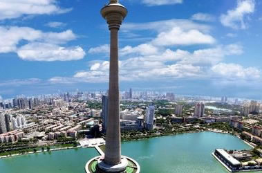 天津廣播電視塔,景名“天塔旋云”,集旅游觀光、餐飲娛樂和廣播電視發(fā)射多功能于一體。天塔總高度415.2米,水榭亭閣式的塔座上,三層跌水倒掛珠簾,水中涌泉撒花揚珠,配以剛?cè)嵯酀、碩長挺拔的塔身,被游人稱為“空中樓閣”。天塔四面環(huán)水,碧波綠水,雄偉的天塔聳立期間,天塔總高度415.2米,水榭亭閣式的塔座上,三層跌水倒掛珠簾,水中涌泉撒花揚珠,配以剛?cè)嵯酀、碩長挺拔的塔身,被游人稱為“空中樓閣”的飛碟型塔樓,這一切相得益彰,使天塔宛若一位臨波出浴的仙子。