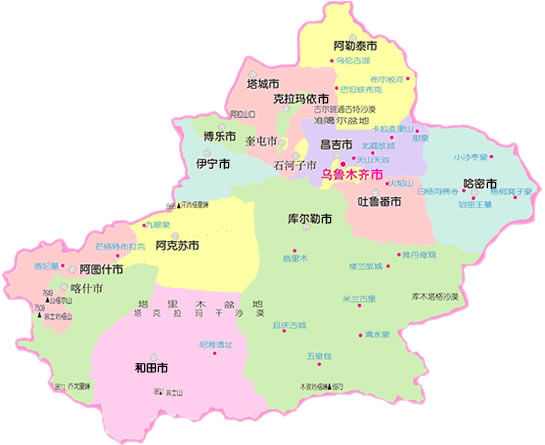 烏魯木齊市 | 克拉瑪依市 | 吐魯番市 | 哈密市 | 和田地區(qū) | 阿克蘇地區(qū) | 喀什地區(qū) | 塔城地區(qū) | 阿勒泰地區(qū) | ||