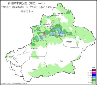 2025年11月5日08時(shí)至6日08時(shí)新疆降水實(shí)況圖 (央廣網(wǎng)發(fā) 新疆氣象局供圖)