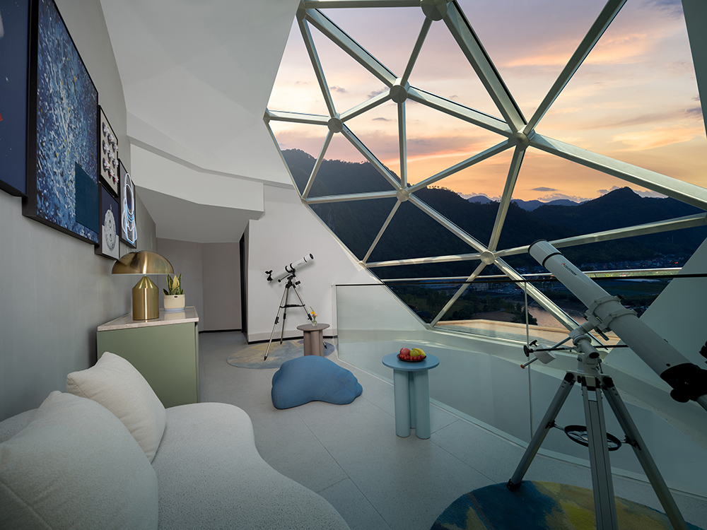 架空設(shè)計(jì)的海螺屋客房隱于林間,如同童話故事中的精靈居所,為住客營(yíng)造出私密而夢(mèng)幻的休憩空間;天文臺(tái)客房懸于巖壁之上,通過客廳的望遠(yuǎn)鏡和全景天窗可賞星河美景,將浩瀚星空引入室內(nèi);炭晶舍客房以傳統(tǒng)炭雕藝術(shù)為靈感,通體的炭黑色藝術(shù)感十足,展現(xiàn)出材料與自然的深度對(duì)話;復(fù)式結(jié)構(gòu)的玉江舍客房,則讓賓客在空間轉(zhuǎn)換中,收獲山川、江潮等不同的觀景視野,實(shí)現(xiàn)移步換景的居住意境。