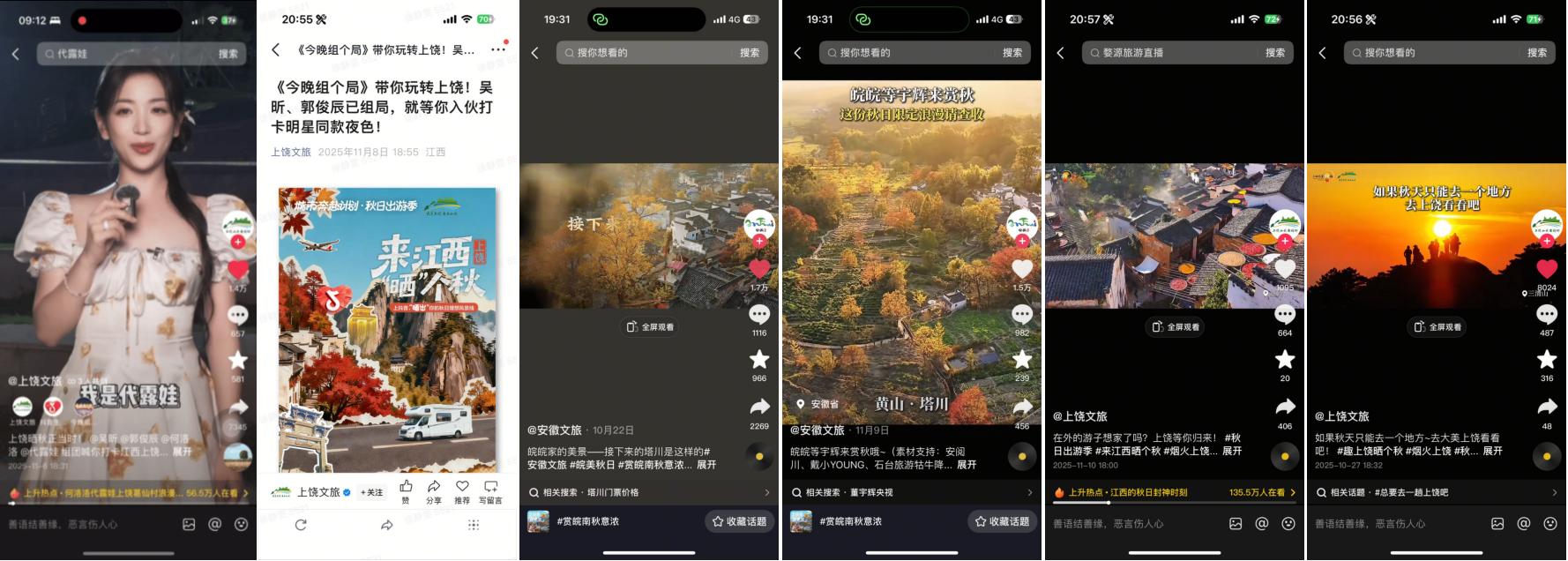 50余位跨界及垂類達(dá)人共同參與秋季種草內(nèi)容創(chuàng)作,整體曝光量突破千萬級(jí)別,覆蓋江西上饒、安徽黃山15家重點(diǎn)頭部商家,以多元化的內(nèi)容視角與持續(xù)的內(nèi)容輸出,形成從點(diǎn)到面的內(nèi)容爆發(fā)態(tài)勢(shì),推動(dòng)江西#婺源曬秋的味道藏不住了 、安徽#潛入徽州的秋日畫卷 等城市賞秋熱點(diǎn)上榜,讓江西與安徽兩地秋景,以更生動(dòng)的方式呈現(xiàn)在用戶面前。