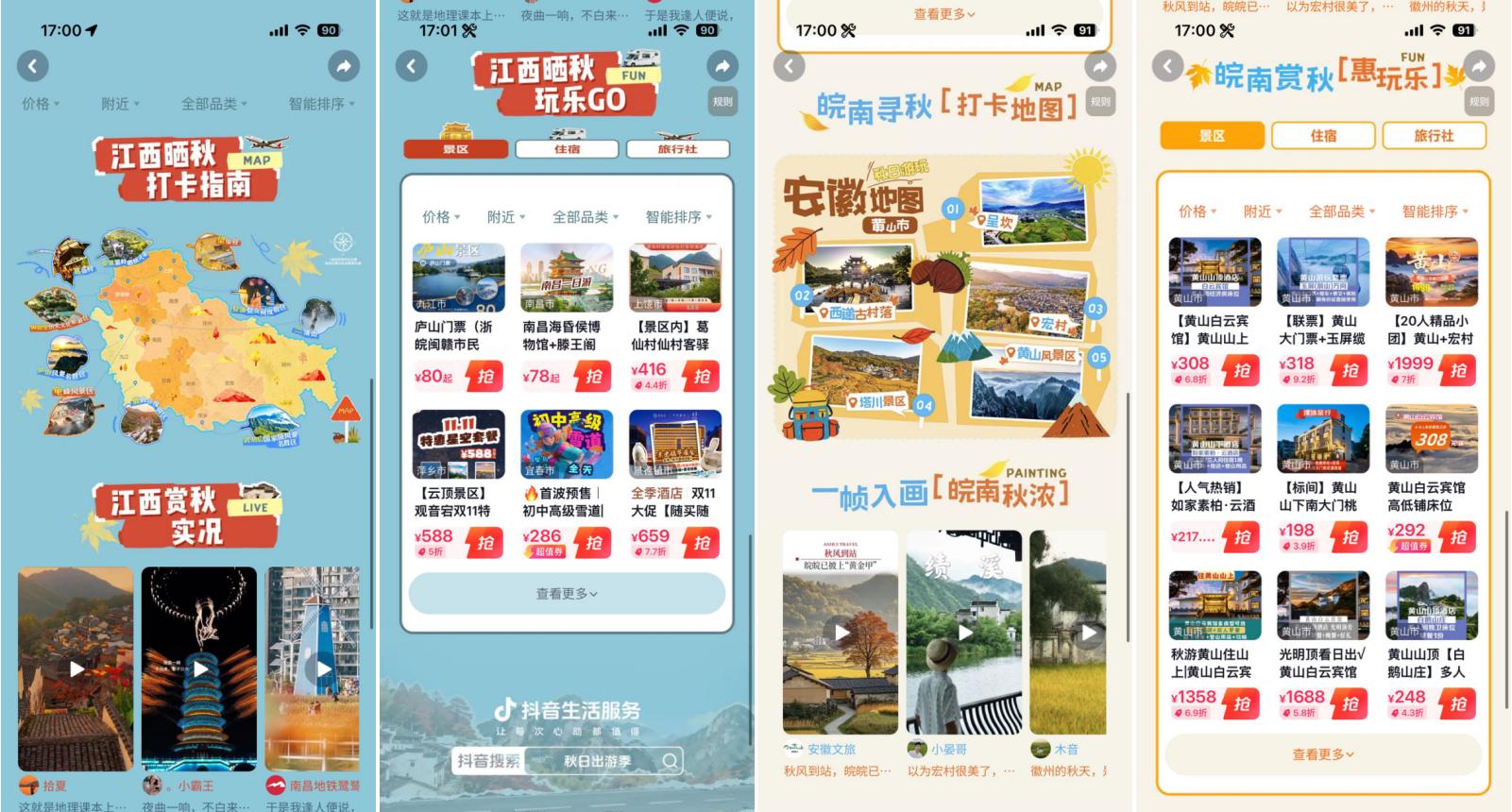 抖音深度響應(yīng)用戶對(duì)季節(jié)限定體驗(yàn)的需求,以“秋日儀式感”為切入點(diǎn),聯(lián)動(dòng)江西和安徽多城自然人文類商家,分別發(fā)起#來江西曬個(gè)秋 與#賞皖南秋意濃 話題活動(dòng),累計(jì)收獲話題總播放量2945萬,用戶投稿4275條,相關(guān)搜索UV突破406萬,同比增長19%。從江西婺源的篁嶺景區(qū)到安徽黃山的三塔景區(qū),從葛仙村的千燈夜游到三清山的云海勝景,抖音平臺(tái)的內(nèi)容生態(tài)與交易場(chǎng)景實(shí)現(xiàn)深度融合,推動(dòng)江西與安徽兩地文旅目的地整體支付達(dá)GMV2.22億元,同比增長246%,讓從發(fā)現(xiàn)出行靈感至完成目的地消費(fèi)的全過程更加順暢自然。