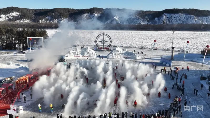 七星廣場上,備受期待的“極寒奇觀秀”在七星廣場震撼上演,身披紅斗篷的居民和游客組成一個巨大的“北”字造型,隨著指令下達(dá),他們同步將滾燙的熱水空中潑灑,在零下三十多攝氏度的極寒空氣中瞬間凝結(jié)成漫天冰晶,銀絮紛飛、弧線交織、光影交錯,構(gòu)成一幅壯闊的極地冰雪畫卷,F(xiàn)場快門聲此起彼伏,大家紛紛用鏡頭記錄這個奇幻瞬間。