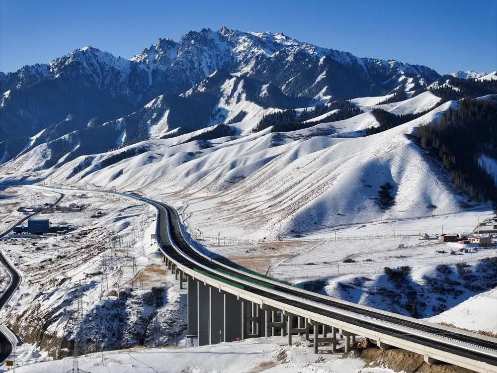 12月下旬,記者驅(qū)車從烏魯木齊前往烏尉高速采訪。寒風(fēng)掠過天山山脊,皚皚白雪覆蓋著險峻山群,層巒疊嶂之中,一條大道向前鋪展,于天山內(nèi)部打通條條隧道,在崇山峻嶺間架設(shè)橋梁。