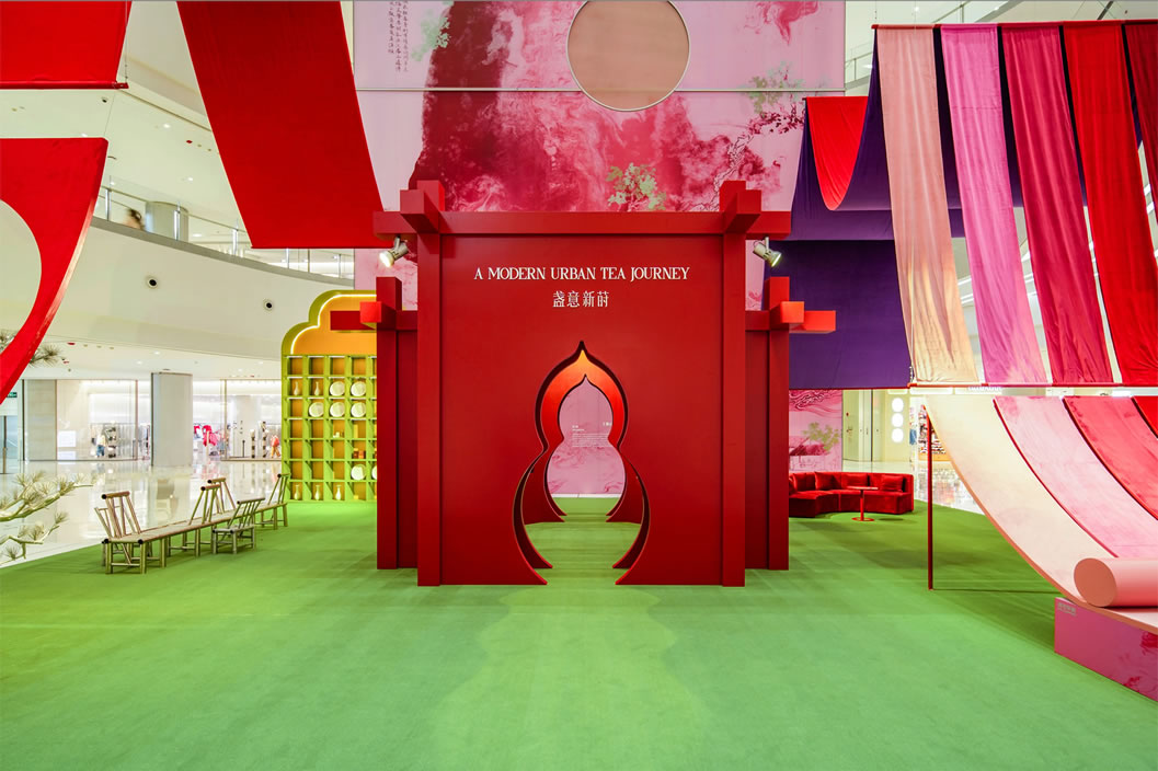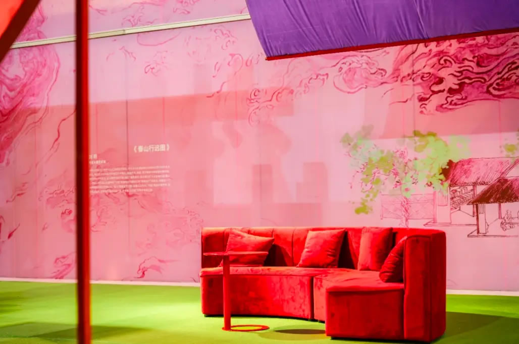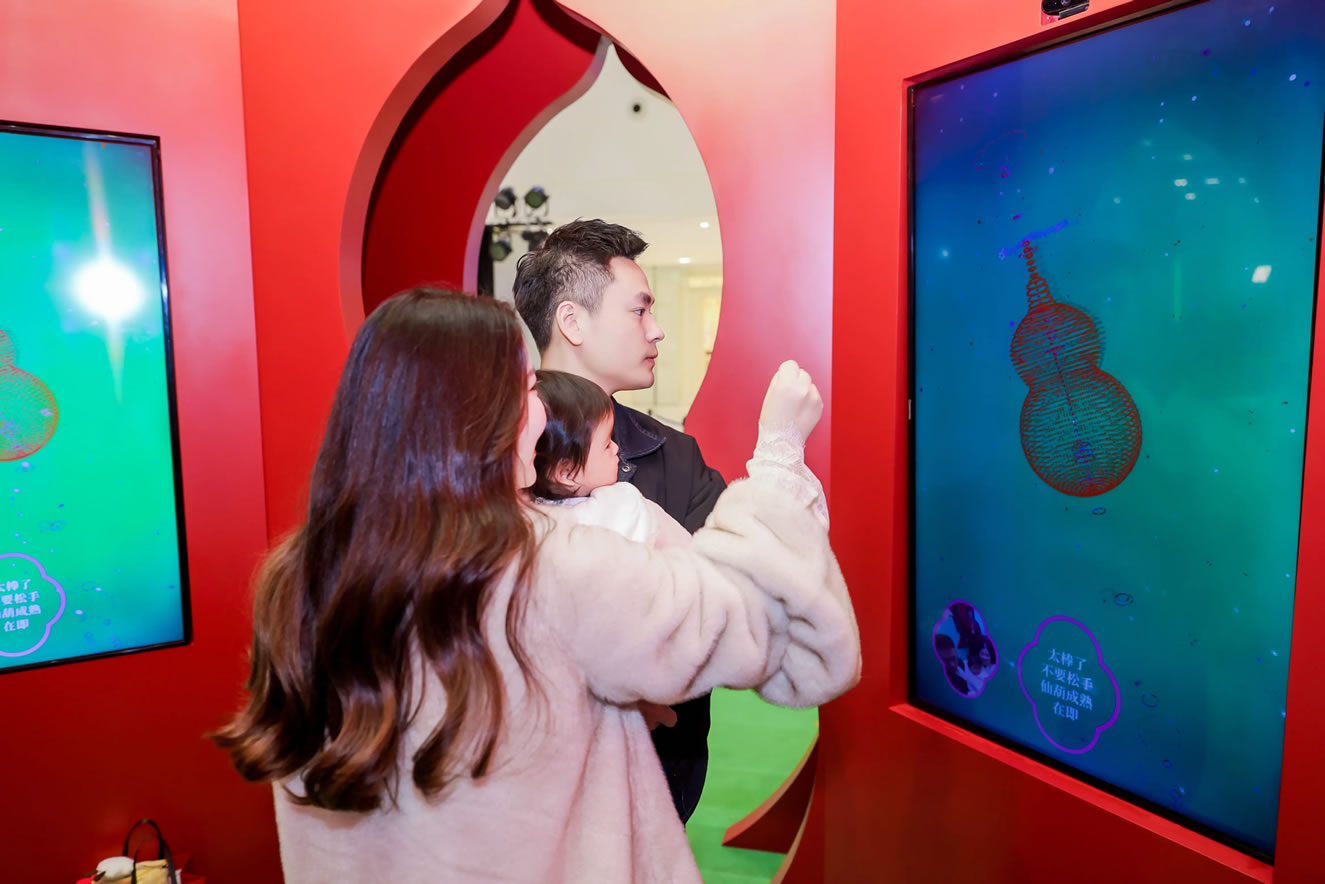 山水,并非遠(yuǎn)行才可得見。書法水墨藝術(shù)家劉玥首展作品《春山行遠(yuǎn)圖》以20米巨幅“山水開卷”,步入其中,與天地春意從容照面;紅色的帷幔落于銀色的松枝上,就像于山間松下靜謐的一隅,“幕下棲心”將是絕佳開年時尚大片的打卡處;松下銀椅,為你與摯友“漫敘往來”的相聚時刻營造出寧靜、松弛的氛圍;多寶閣中陳列著未經(jīng)雕琢的茶器素胚與場內(nèi)品牌萬仟堂,長沙尼依格羅酒店及tea'stone帶來的新春茶器,以“初芒蘊(yùn)能”詮釋著未來的無限可能與新生力量。轉(zhuǎn)身與“蒔光種愿” 四方亭相遇。葫蘆門朝四方而開,寓意著納四方福祿,步入其中,與數(shù)字交互藝術(shù)家吳旭首展作品《無限福祿》體驗(yàn)互動,跟隨指引揮動手勢,觸發(fā)粒子凝聚為動態(tài)“福”字,親手完成一場新春祈福儀式。我們把象征團(tuán)圓與喜悅的紅色沙發(fā)打造“盞間聚暖”,如懷抱般圍合的布局作為“歸處”的隱喻。與家人團(tuán)聚便是心歸處,這將是中國年最圓滿的意象。