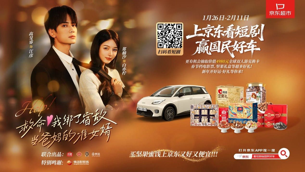 其中,京東旅行順應(yīng)當(dāng)下短劇熱門趨勢(shì),與京東超市堅(jiān)果蜜餞品類攜手創(chuàng)新內(nèi)容營銷合作模式,聯(lián)合橫店影視城和沃隆、三胖蛋、臻味、京覓等堅(jiān)果品牌,聚焦春節(jié)團(tuán)圓、父母催婚等節(jié)點(diǎn)話題打造的定制輕喜微短劇,在呈現(xiàn)闔家歡樂的劇情中,自然融入京東堅(jiān)果品類心智,并聯(lián)合站內(nèi)看短劇贏國民好車的互動(dòng)活動(dòng),為品類品牌的年貨節(jié)營銷打開新的思路,實(shí)現(xiàn)曝光-心智-引流-轉(zhuǎn)化的營銷閉環(huán)。