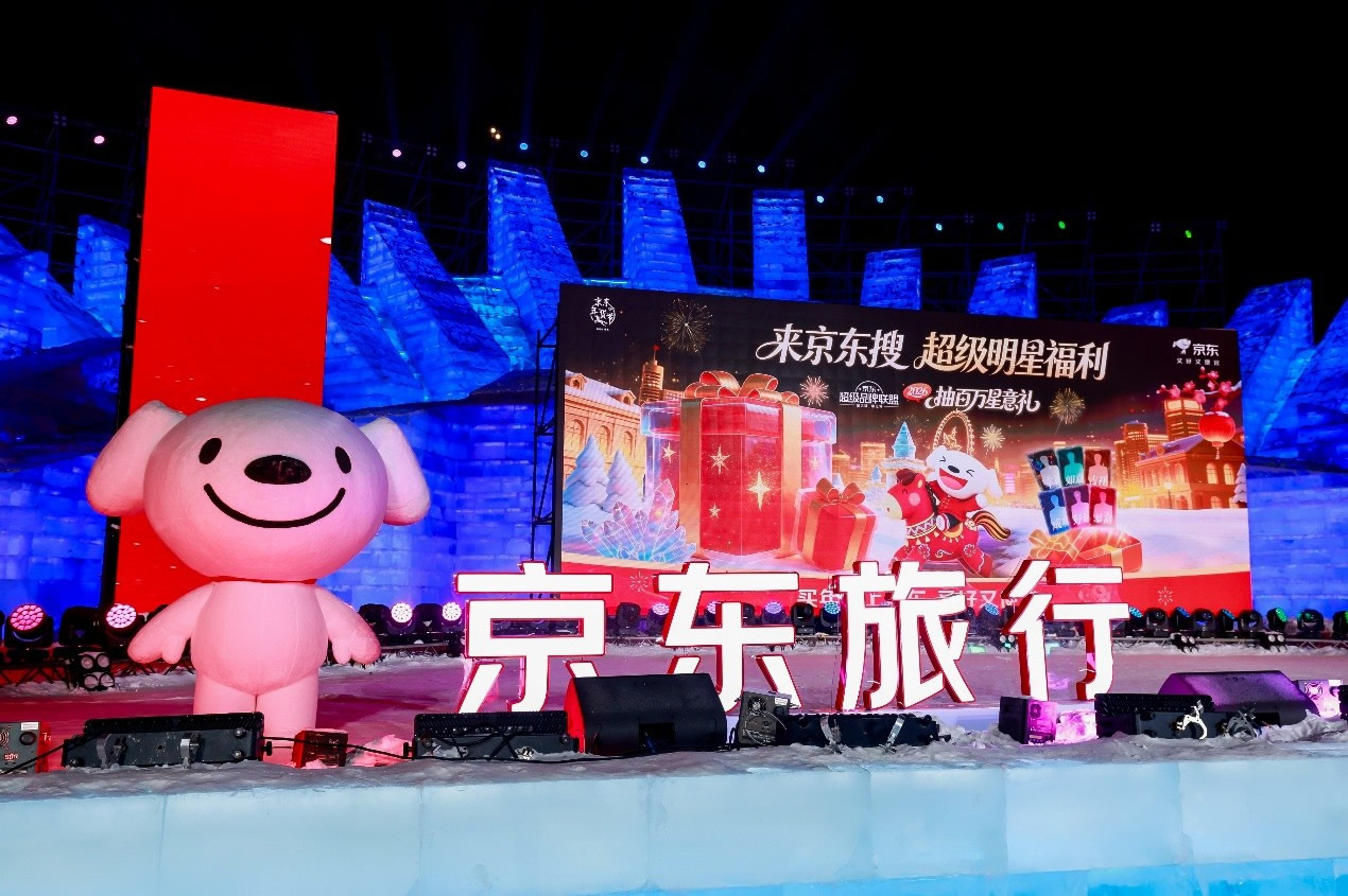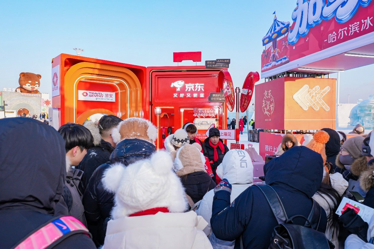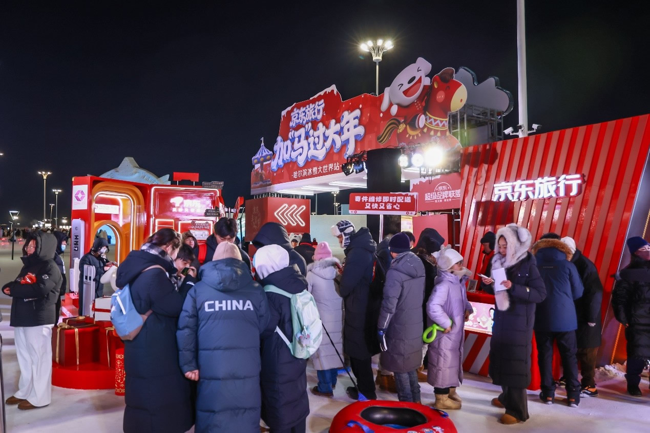 京東旅行在此次年貨節(jié)中深度融合兩大頂流文旅場(chǎng)景,實(shí)現(xiàn)線下事件與品牌傳播的雙重引爆。在哈爾濱冰雪大世界,京東旅行攜手京東箱包、京東健康、超級(jí)品牌聯(lián)盟、旅安、歐舒丹等品類品牌,依托其冬季頂流景區(qū)的話題熱度,通過多維互動(dòng)營銷方式打造沉浸式跨界體驗(yàn):不僅設(shè)置“冰雪年貨快閃活動(dòng)”開展品牌展示與互動(dòng)游戲,更通過地標(biāo)冰雪摩天輪、無人機(jī)表演、冰雪大舞臺(tái)廣告/立體字/主持人口播、區(qū)域植入品牌立體廣告等豐富營銷形式,共同實(shí)現(xiàn)品牌與景區(qū)流量的深度共振。