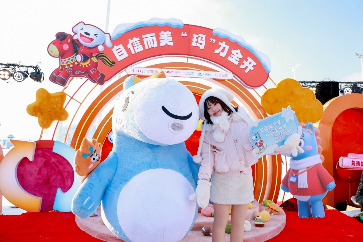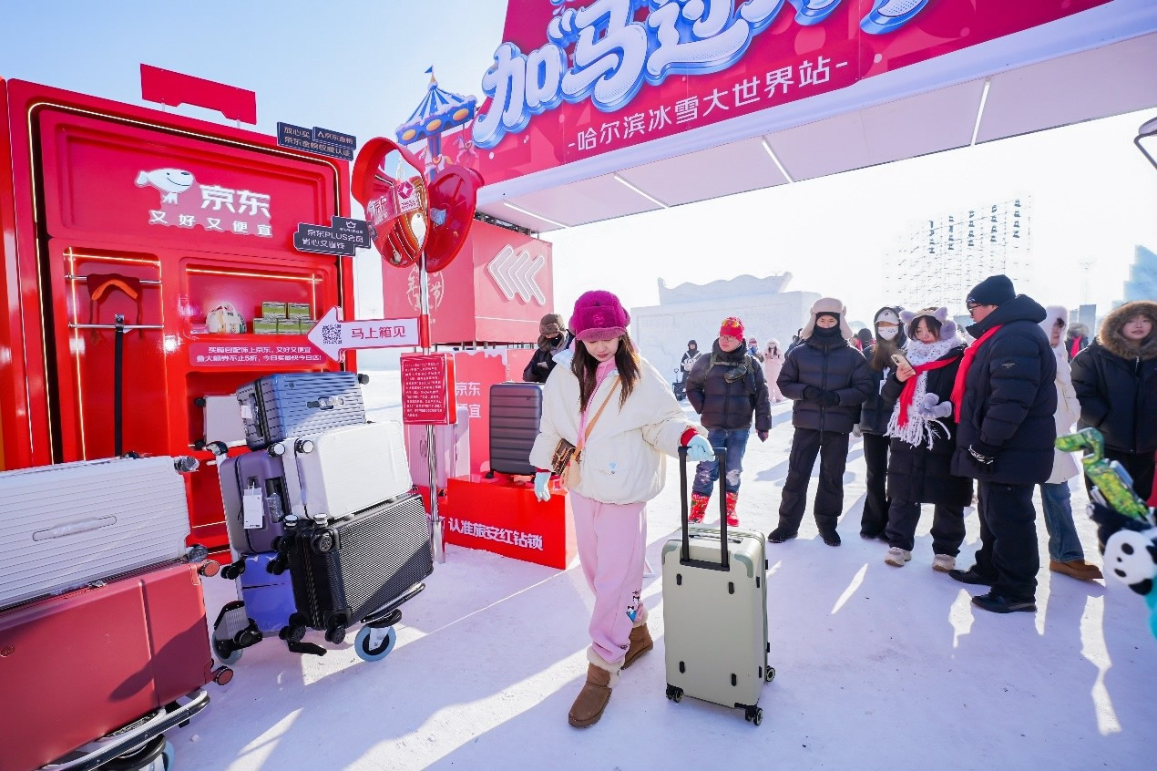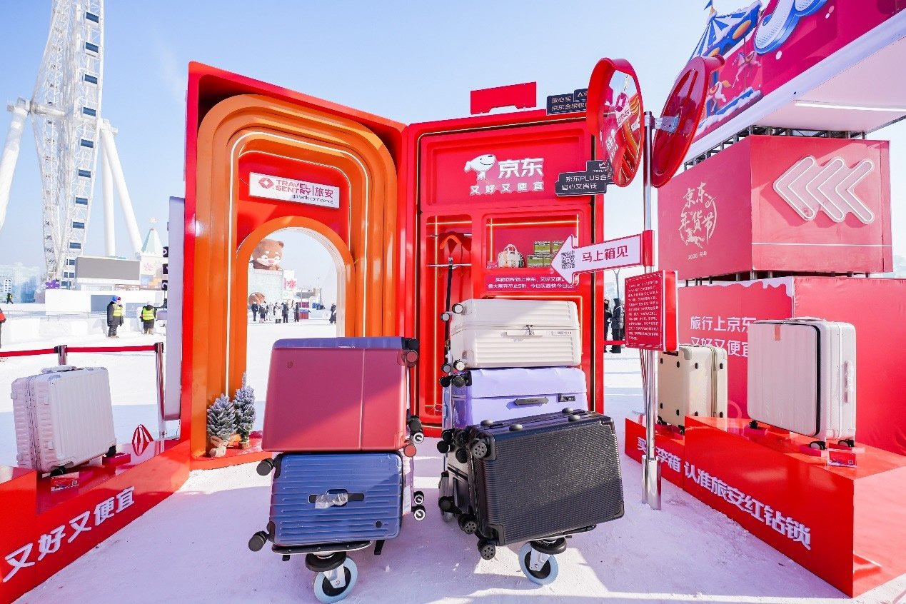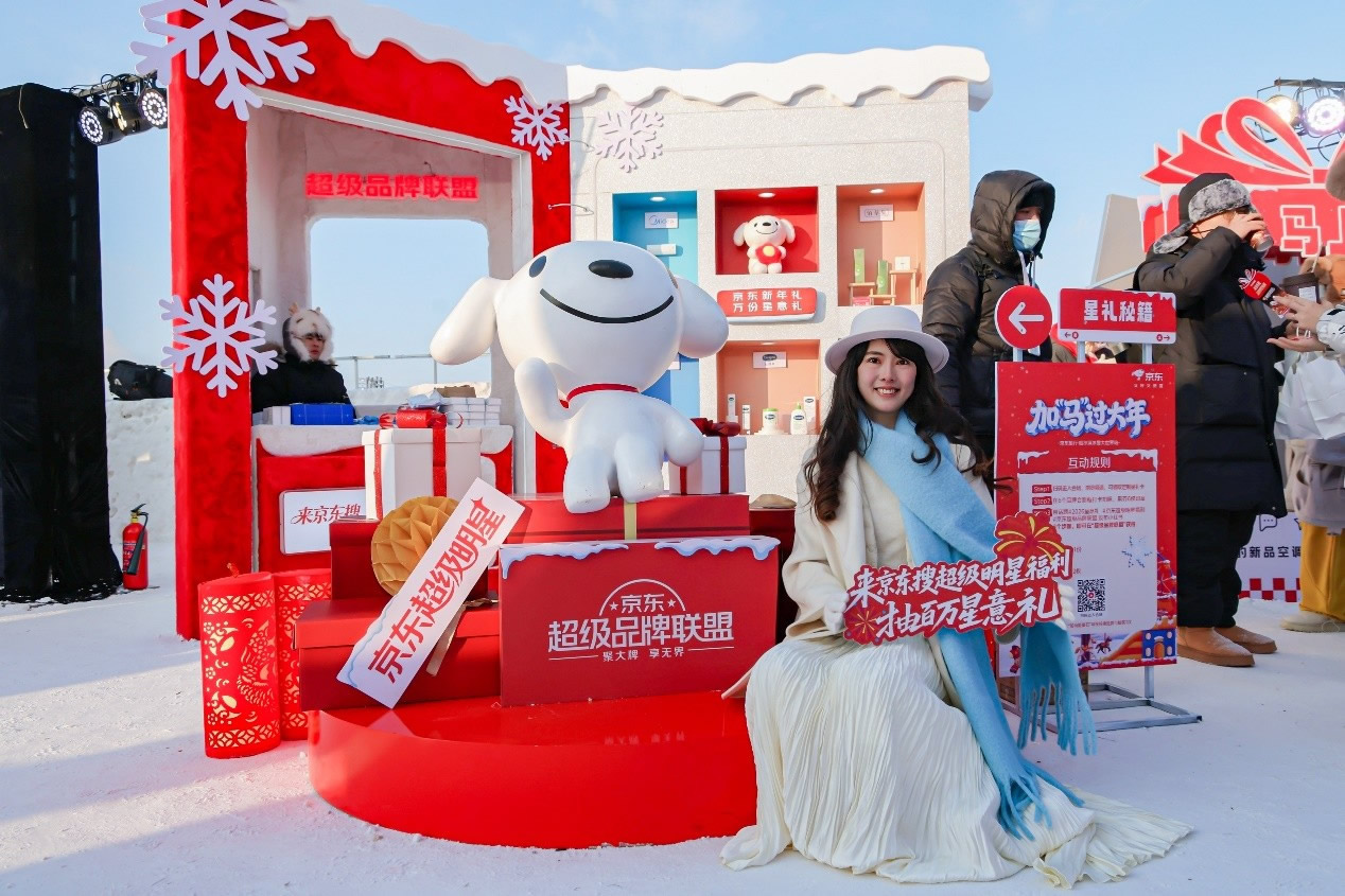 京東旅行在此次年貨節(jié)中深度融合兩大頂流文旅場(chǎng)景,實(shí)現(xiàn)線下事件與品牌傳播的雙重引爆。在哈爾濱冰雪大世界,京東旅行攜手京東箱包、京東健康、超級(jí)品牌聯(lián)盟、旅安、歐舒丹等品類品牌,依托其冬季頂流景區(qū)的話題熱度,通過多維互動(dòng)營銷方式打造沉浸式跨界體驗(yàn):不僅設(shè)置“冰雪年貨快閃活動(dòng)”開展品牌展示與互動(dòng)游戲,更通過地標(biāo)冰雪摩天輪、無人機(jī)表演、冰雪大舞臺(tái)廣告/立體字/主持人口播、區(qū)域植入品牌立體廣告等豐富營銷形式,共同實(shí)現(xiàn)品牌與景區(qū)流量的深度共振。