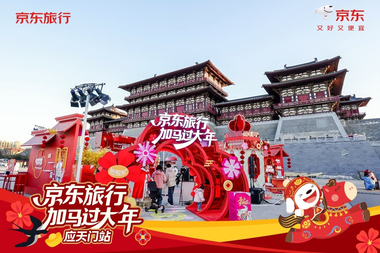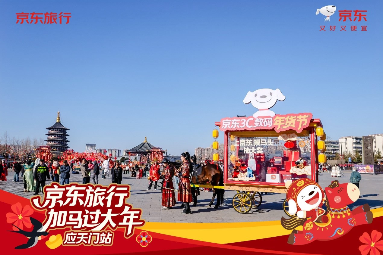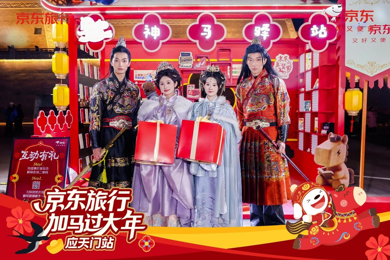 與此同時(shí),在洛陽應(yīng)天門景區(qū),京東旅行攜手京東數(shù)碼、京東物流、伊利等品類品牌,以“國風(fēng)快閃”為核心形式,融合真實(shí)馬匹巡游、唐風(fēng)NPC互動(dòng)、馬車送年貨等話題事件,將傳統(tǒng)文化場(chǎng)景與品牌產(chǎn)品自然嫁接,不僅強(qiáng)化了景區(qū)文化體驗(yàn)的鮮活感,更通過“真馬營銷”等創(chuàng)新手段在社交平臺(tái)形成二次傳播,成功塑造了“文旅+品牌”的場(chǎng)景營銷新范式。