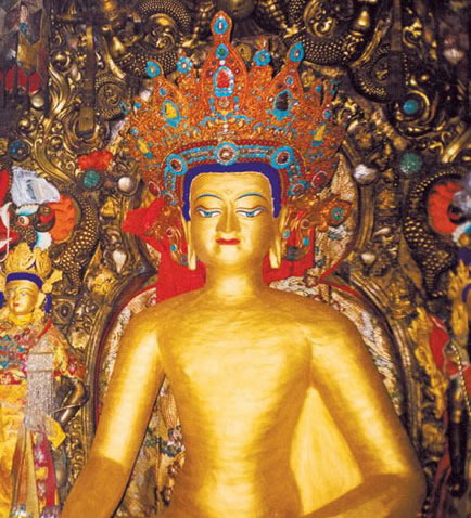 酥油燈后是大昭寺主殿正門,大昭寺最早的建筑都從正門開始;外院是后來修建、擴充的,而主殿是1400多年前的建筑。由于多年信徒的摩擦,門口的石頭地板光亮如鏡。大殿左右各有一尊巨大的佛像。左側(cè)為紅教創(chuàng)始人密宗大師蓮花生,他本來是印度的佛學(xué)家,公元八世紀(jì)進藏,在他入藏以后藏區(qū)開始出現(xiàn)密宗。右側(cè)是未來佛。