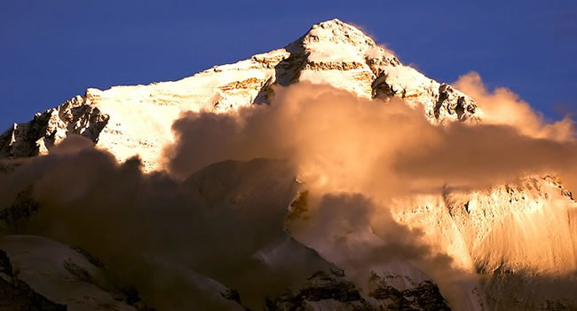 珠穆朗瑪峰地區(qū)及其附近高峰的氣候復(fù)雜多變,即使在一天之內(nèi),也往往變化莫測。大體來說,每年6月初至9月中旬為雨季,強烈的東南季風造成暴雨頻繁,云霧彌漫,冰雪肆虐無常的惡劣氣候。11月中旬至翌年2月中旬,因受強勁的西北寒流控制,最低氣溫可達-50℃,平均氣溫在-30℃左右。最大風速可達90米/秒。每年3月初至5月末是風季過渡至雨季的春季,而9月初至10月末是雨季過渡至風季的秋季,在這兩個季節(jié)期間,有可能出現(xiàn)較好的天氣。