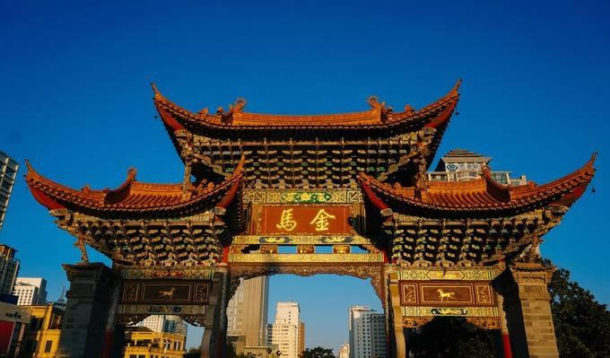 金馬碧雞坊,位于昆明市中軸線的三市街與金碧路交叉口,高12米、寬18米。東坊臨金馬山,名金馬坊;西坊靠碧雞山,名碧雞坊。該坊雕梁畫棟,始建于明朝宣德年間。