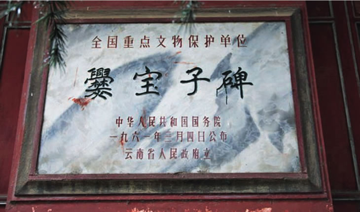 在越州楊旗出土的爨寶子碑全稱為“晉故振威將軍建寧太守爨府君墓”碑,立于東晉大亨四年(公元405年)!鹅鄬氉颖肥请`書向楷書過渡的典型碑刻;碑文通篇為六朝時期的駢文體;也是研究南北朝時期云南地方史不可多得史料。1961年,國務(wù)院將其公布為第一批全國重點文物保護(hù)單位。存于曲靖一中。