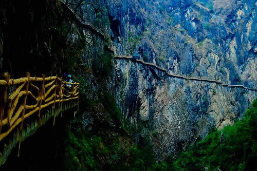 、诟呖諚5捞诫U(xiǎn)游路:福緣橋——龍王廟——天開石門——鶴峰亭——五道水服務(wù)區(qū)——高空玻璃棧道——七彩玻璃觀景平臺(tái)——高空棧道——七道水彩虹橋——七道水瀑布——野生芭蕉林——百步天梯——萬獸谷——枯木要塞。全長(zhǎng)3500米,