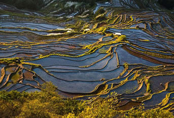 元陽(yáng)梯田,位于云南省紅河州元陽(yáng)縣的哀牢山南部,是哈尼族人世世代代留下的杰作。元陽(yáng)梯田是紅河哈尼梯田的核心區(qū)。紅河哈尼梯田是以哈尼族為主的各族人民利用特殊地理氣候同墾共創(chuàng)的梯田農(nóng)耕文明奇觀,規(guī)模宏大,氣勢(shì)磅礴。元陽(yáng)哈尼族開(kāi)墾的梯田隨山勢(shì)地形變化,坡緩地大則開(kāi)墾大田,坡陡地小則開(kāi)墾小田,甚至溝邊坎下石隙也開(kāi)田,因而梯田大者有數(shù)畝,小者僅有簸箕大,往往一坡就有成千上萬(wàn)畝。
