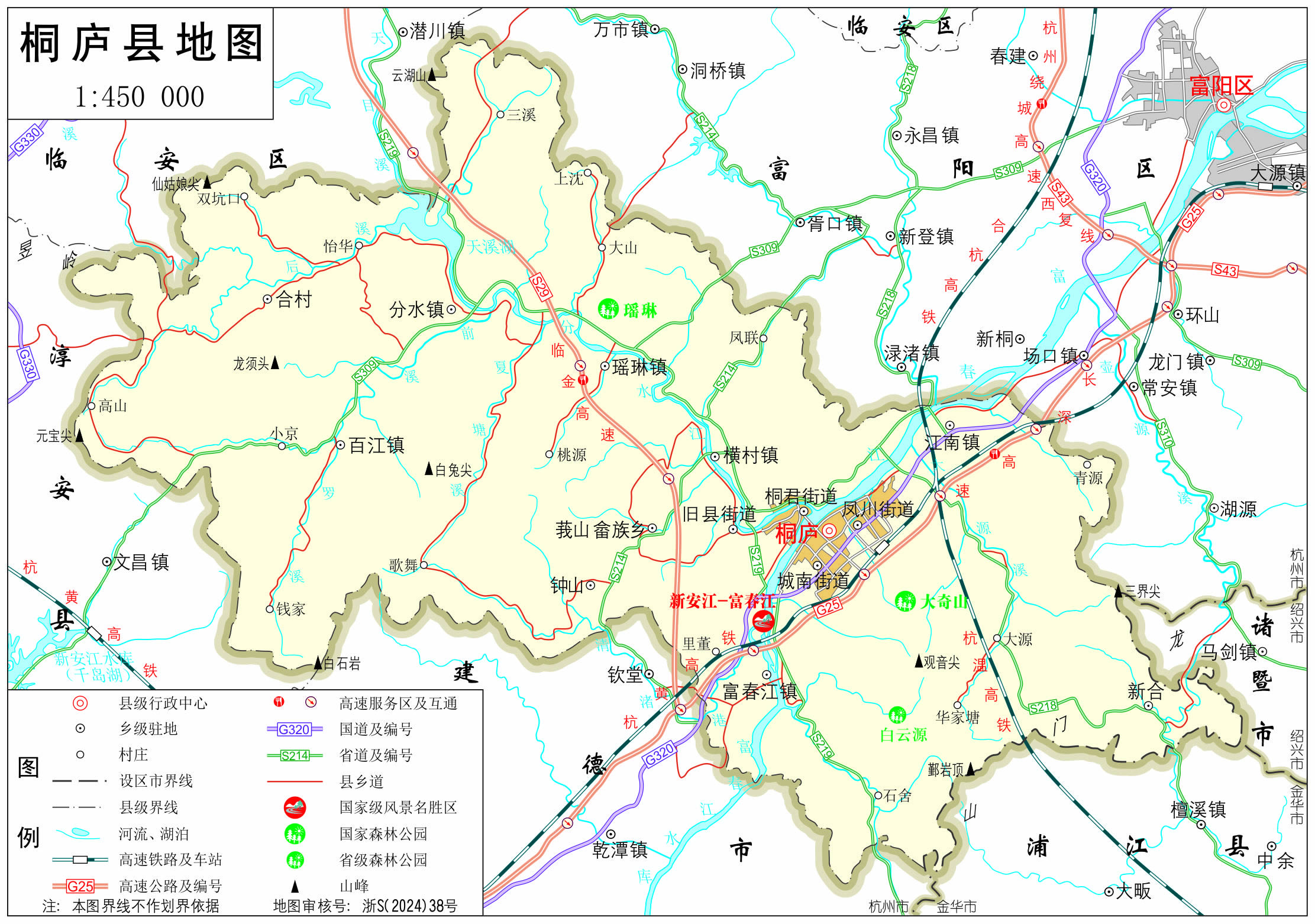 以縣城桐君街道為中心,東20公里(徑距,下同)至牛峰嶺界富陽,南19公里至羊嶠頂界建德,西39公里至太陽山界淳安,北13公里至陳家山界富陽;東南27公里至火燒灣頂界浦江,西南12公里至大巖山界建德,東北16公里至橫山埠界富陽,西北41公里至高塘界臨安。