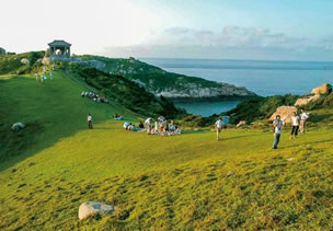 天然草坪西側山上,有一巨崖,橫臥地上,像一頭俯伏的雄獅、從北看,又似伸長鼻子的大象。東側山上巖群中,還有一只大象的頭、長鼻子向下延伸,一雙眼睛向游客凝視。鄰近石像一頭海龜,翹首藍天,似在仰望著翱翔的鷗鳥。