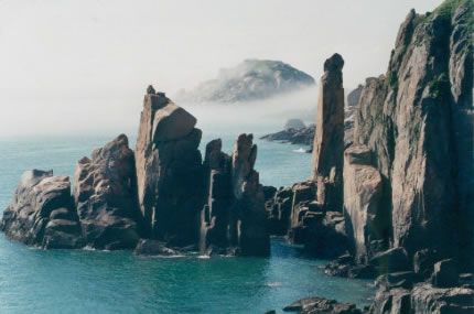 慈航普渡的觀世音菩薩在南麂列島定格、凝固成了高20米的天然巨像,它身披風帔(俗稱“觀音兜”),垂著兩袖,眉目宛然,專注地向東海第面凝視。然而這觀音巖腳下全是刀劍般的礁石,潮來時淹滿水,更像是泥犁地獄了。而在不遠的1.5米外,有5支石柱聳立,其中最高的柱頂,酷似調皮搗亂和小猴子。它在觀音菩薩面前,有所窺伺,又有所祈求。更令人驚奇的是,景隨步移,若南行數(shù)十步,從另一個角度望,慈目的妙齡觀音卻突然變成了老態(tài)龍鐘的南極仙翁,故人們又稱之“壽星巖”。移步換形不僅平尜游人興趣,而且從“雙面人”身上也不有同感悟。