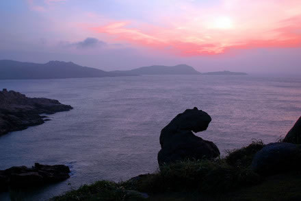 南麂島有兩座山,一座叫南麂山,高192米,另一座叫大山,高229米。這兩山蟠踞在一起,東南面形成了大沙岙,西北面形成了馬祖岙,站在山巔可望東海萬頃云濤。尤其是看日出,一輪紅日,躍出在海平線上;紅日西沉,則滿天彩霞,逐步消失于蒼茫的暮色之中。