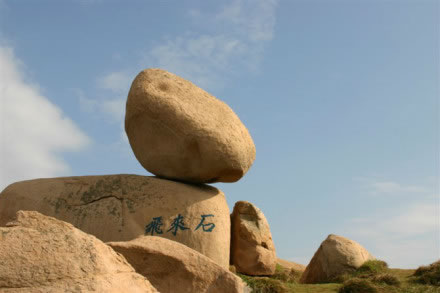 在關爺磨刀石前面有一塊巨石,左右角上方矗立著一塊石筍,猶如天際飛來,叫做“飛來石”,搖搖欲墜,卻又巋然不動。