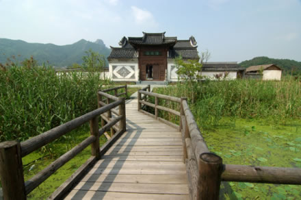陸家莊在《神雕俠侶》中是陸展元、陸立鼎兩兄弟的莊院,小說(shuō)第一回中寫(xiě)道的故事情節(jié)就是在這府院發(fā)生的。陸家莊是影城中相對(duì)獨(dú)立的一個(gè)景點(diǎn),主要由碼頭、風(fēng)雨亭、路棚、陸家莊院和農(nóng)戶院組成。這里三面有湖,展現(xiàn)的是古代農(nóng)村自然淳樸的風(fēng)格和農(nóng)家田園風(fēng)光。