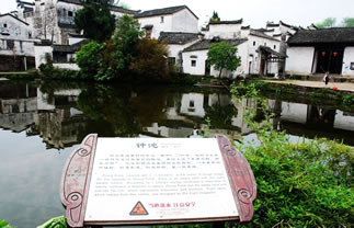 鐘池位于諸葛村的中心,在大公堂正前面,面積0.24公頃,它的邊上是一塊與它逆對(duì)稱面積的陸地,村民用以曬場(chǎng)之用。易經(jīng)上說“東南為陽、西北為陰”再加上“天圓地方”之說,空地和鐘池正呈陰陽太極圖形。陸地靠北和鐘池靠南各有一顆水井,正是太極中的魚眼。鐘池的南岸是一個(gè)陡坡,順著陡坡而建的幾幢大房子從北岸望去一幢比一幢高,加上前面貼水一溜小平房,跌宕起伏,輪廓線大起大落,景象峭拔而優(yōu)美。