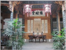 鐘池四周伸展出八條小巷,特點(diǎn)各個(gè)不同,形成了坎、艮、震、巽、離、坤、兌、乾八個(gè)部位。大公堂就在它的坎宮部位,從它的正門邊上東而去的一條十分幽深,一層層的臺(tái)階上坡,左側(cè)是綠蔭如蓋的園子,的一右側(cè)是一排排住宅的后墻,這條巷是通往村中十八廳堂之一的積慶堂的。鐘池東面條巷子很平直,100米長(zhǎng)。八條小巷似通卻閉,似連卻斷,虛虛實(shí)實(shí),猶如一張蜘蛛網(wǎng),又宛如一座迷宮。